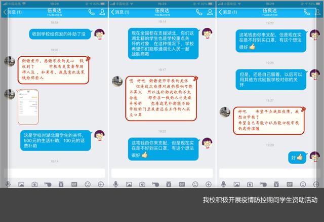 多项措施并举,全面精准帮扶。为进一步加大对家庭经济困难学生的资助力度和覆盖面,学校对因疫情影响导致家庭经济困难的学生,根据不同困难情况开设相应资助。一是为解决疫情期间湖北省学生的网络上课和生活上的实际困难,对家在湖北省或因打工而滞留在湖北省的学生,按照每人600元的标准发放疫情期间手机流量补贴和生活补贴;二是为保障家庭经济困难学生在疫情期间顺利开展网络学习,确保“停课不停学”,对他们按照每生100元的标准发放手机上网流量补助;三是对于家庭经济长期处于特别困难的学生继续开展隐形资助,按照每生300元的标准发放隐性资助补贴;四是在学生返校期间,将根据困难学生返校的实际情况发放返校路费补贴。另外,对家庭状况发生突然变化引起的经济困难的学生,学校及时进行临时困难帮扶;对在疫情防控期间,在家乡主动参加疫情防控的学生,给予一定的生活补贴,鼓励学生为疫情防控做出的贡献。学校通过多种方式开展精准有效资助,把学校的关怀送到学生的心坎上。