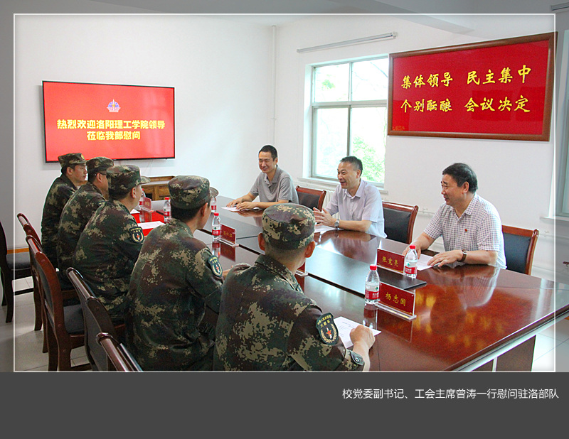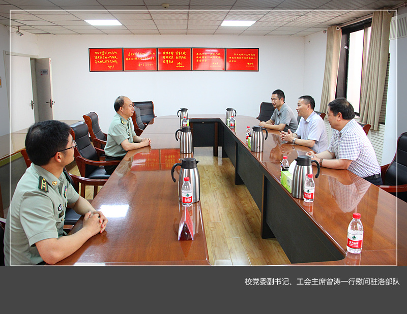 在中国人民解放军建军93周年来临之际,为进一步扎实做好“八一”期间拥军优属工作,进一步密切军政军民关系, 7月29日,校党委副书记、工会主席曾涛带领武装部负责人一行分赴洛阳市军分区、驻洛某部、洛龙区人武部等与我校建立军校共建的四个单位代表学校党委进行慰问走访、座谈交流,同洛阳市军分区政委李杏等领导和驻洛某部官兵进行座谈。