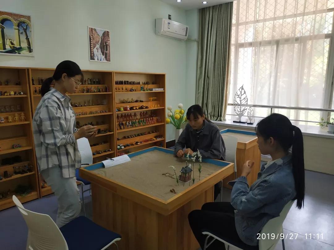 为了让同学们更深入地了解咨询的流程,黄老师安排实习生进行预约接待和来访者信息收集工作,同学们热情周到的服务以及认真的工作态度赢得了来访学生的信任,这也为她们进一步了解心理咨询的内涵打下了良好的基础。在第二小组王城校区的实习接近尾声时,黄老师组织她们进行了沙盘游戏体验活动,同学们充满热情,和小伙伴的配合度也很高,最后她们为小组成员共同完成的作品命名为“海滨小镇”。